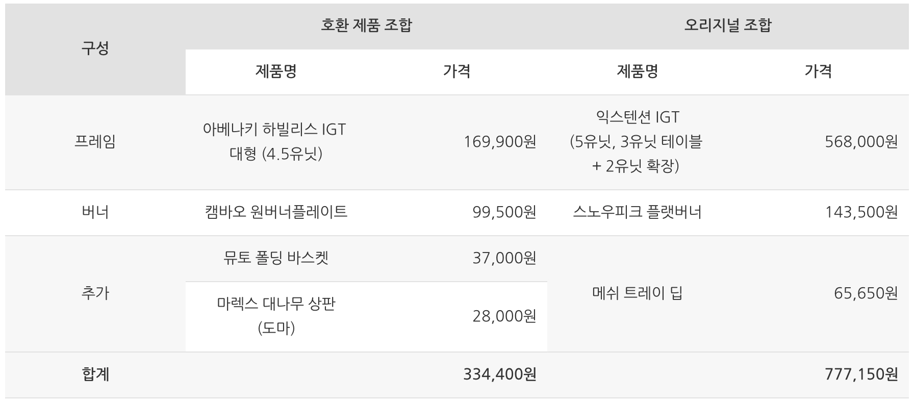 A. 호환 제품은 스노우피크 정품 대비 5-70% 가격이에요. 마감과 내구성에서 차이가 있지만 기능은 충분해요.